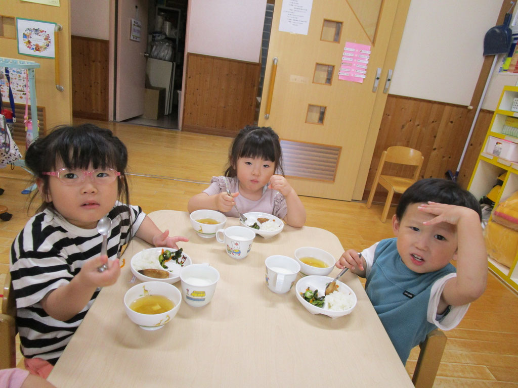 たくさん遊んだ後は皆の大好きな給食の時間!美味しい給食をモリモリおかわりして食べていますよ☆たくさん食べていっぱい遊んで、スクスク大きくなってね(*^^*)